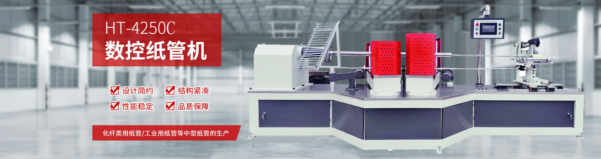 本公司是從事紙管設備開發及生產的企業,公司推行質量管理體系,具有完善的生產設備、生產工藝、嚴格的檢測手段,同時吸收國外進口機械的技術設計制造適合國內生產需要的紙管設備,如:HT-1600A型分切機, HT-1600B型分切機, HT-2150B型紙管機,HT-3250B型紙管機,HT-4250B型紙管機,HT-4550B型紙管機,HT-800A型切管機,HT-200B型多刀精切機,HT-100A全自動紙管精整機等紙管機械。